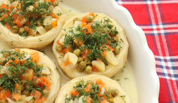 Pişmiş enginarlar soğuyunca çukur tarafları yukarı gelecek şekilde servis tabağına alın. Enginarların içine patates, bezelye, havuç, bir adet arpacık soğanı koyun. Diğer malzemeyi servis tabağına yayıp, yağlı suyunu da üzerine dökün. Dereotlarını sap sap dekoratif şekilde servis tabağına yerleştirin.
